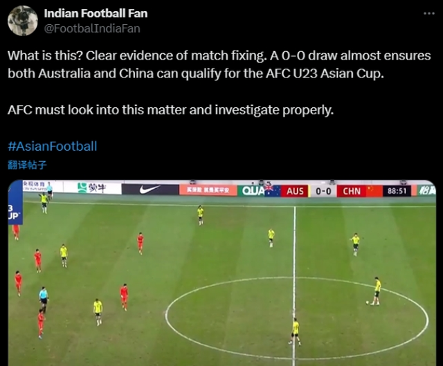 “这是什么?这明显是假球的证据。一场0比0的平局几乎能确保澳大利亚和中国队都能晋级U23亚洲杯。亚足联必须彻查此事并开展妥善调查!”