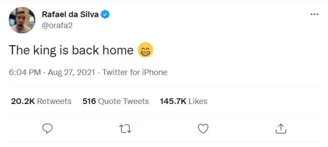 除了这条推文,B费还发文表示:永远不要停止梦想!欢迎GOAT回家!