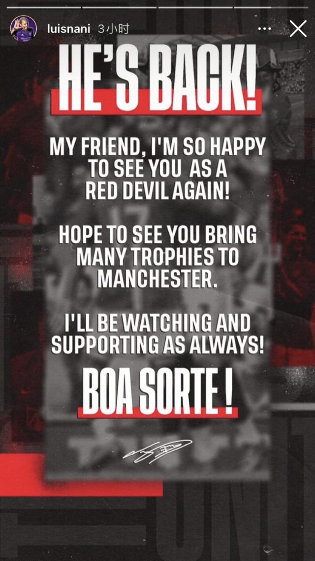纳尼:朋友,很高兴看到你再次成为“红魔”!希望你能够再为曼联带来很多奖杯,我会像一直以来一样关注和支持你!祝你好运!
